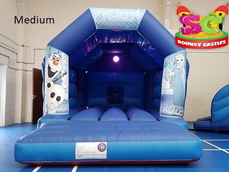 Our medium Froze bouncy castle measures 11ft x15ft so it suitable for a small party or for a standard sized garden. There's images of Elsa and her friends all around the front of the castle, perfect for your little ladies party in Chesterfield or Sheffield. Space needed will be 13ft x 20ft to account for the safety mat at the front and the blower behind the castle.