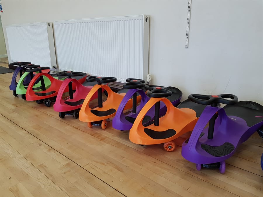 These cars are great fun for children, so much so that they actually prefer zooming around on these more than bouncing on the bouncy castle. They work by turning the steering wheel side to side which propels the rider forward although we notice a lot of younger children just use their feet.